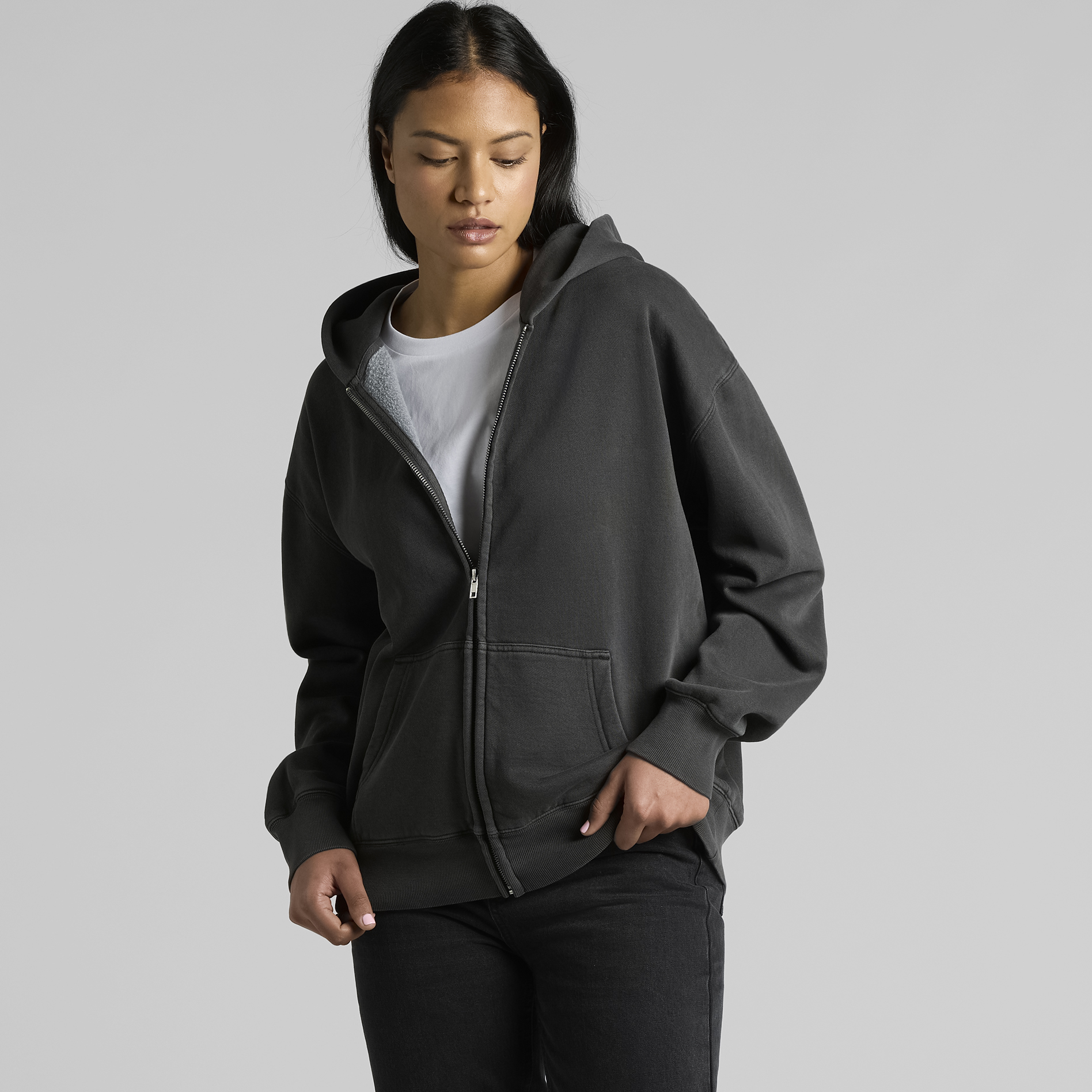 Construction: Garment dyed, zip hood, drop shoulder, kangaroo pocket, self-fabric lined hood, no drawcord, SBS two-way zip, sleeve cuff ribbing, CVC fleece, preshrunk to minimise shrinka